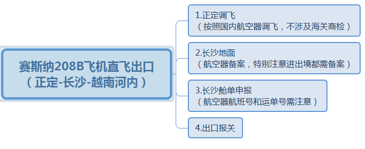 某客戶從美國(guó)CESSNA公司以進(jìn)口集裝箱的形式進(jìn)口飛機(jī)套件,以整機(jī)名義申報(bào)進(jìn)口,套件到中國(guó)工廠組裝后試飛交付給使用單位。2013-2017年主要針對(duì)中國(guó)境內(nèi)客戶銷售,2018年與越南客戶達(dá)成合作意向,越南客戶從客戶處采購(gòu)一架組裝下線的Cessna 208 CARAVAN,類型:?jiǎn)伟l(fā)渦槳式多用途輕型飛機(jī)。2018年12月確定執(zhí)行交付任務(wù),要求12月底交付完成,客戶負(fù)責(zé)交付到越南河內(nèi)國(guó)際機(jī)場(chǎng)。飛行路線是:欒城—正定—長(zhǎng)沙—河內(nèi),我司負(fù)責(zé)石家莊地面服務(wù)和長(zhǎng)沙出境報(bào)關(guān)報(bào)檢。