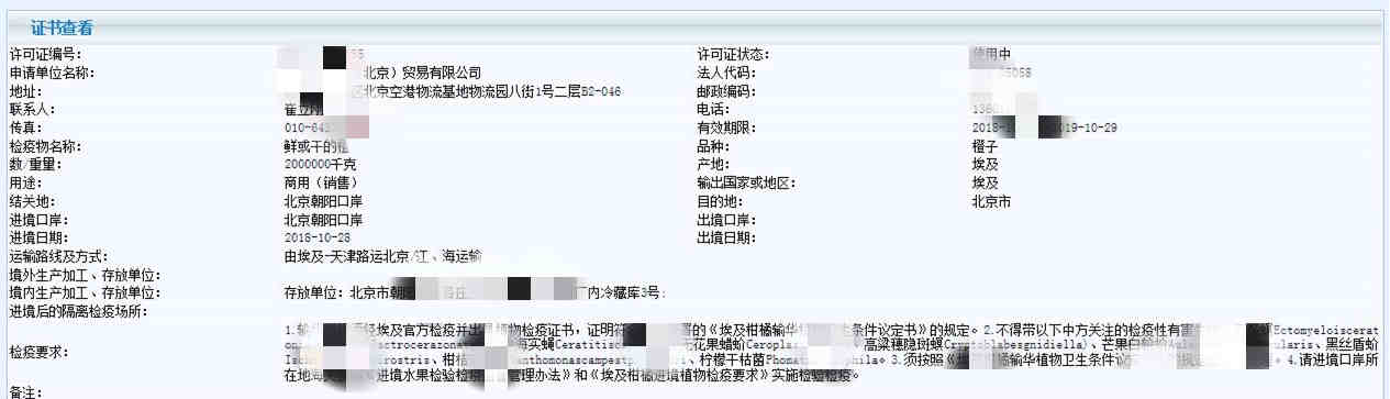 Then enter http://online.customs.gov.cn/ the Internet + customs platform, in the "import and export food" module, do "import aquatic product storage cold record", and then in "import and export animal and plant quarantine" module to do "import plant and product quarantine approval", get the following quarantine certificate.