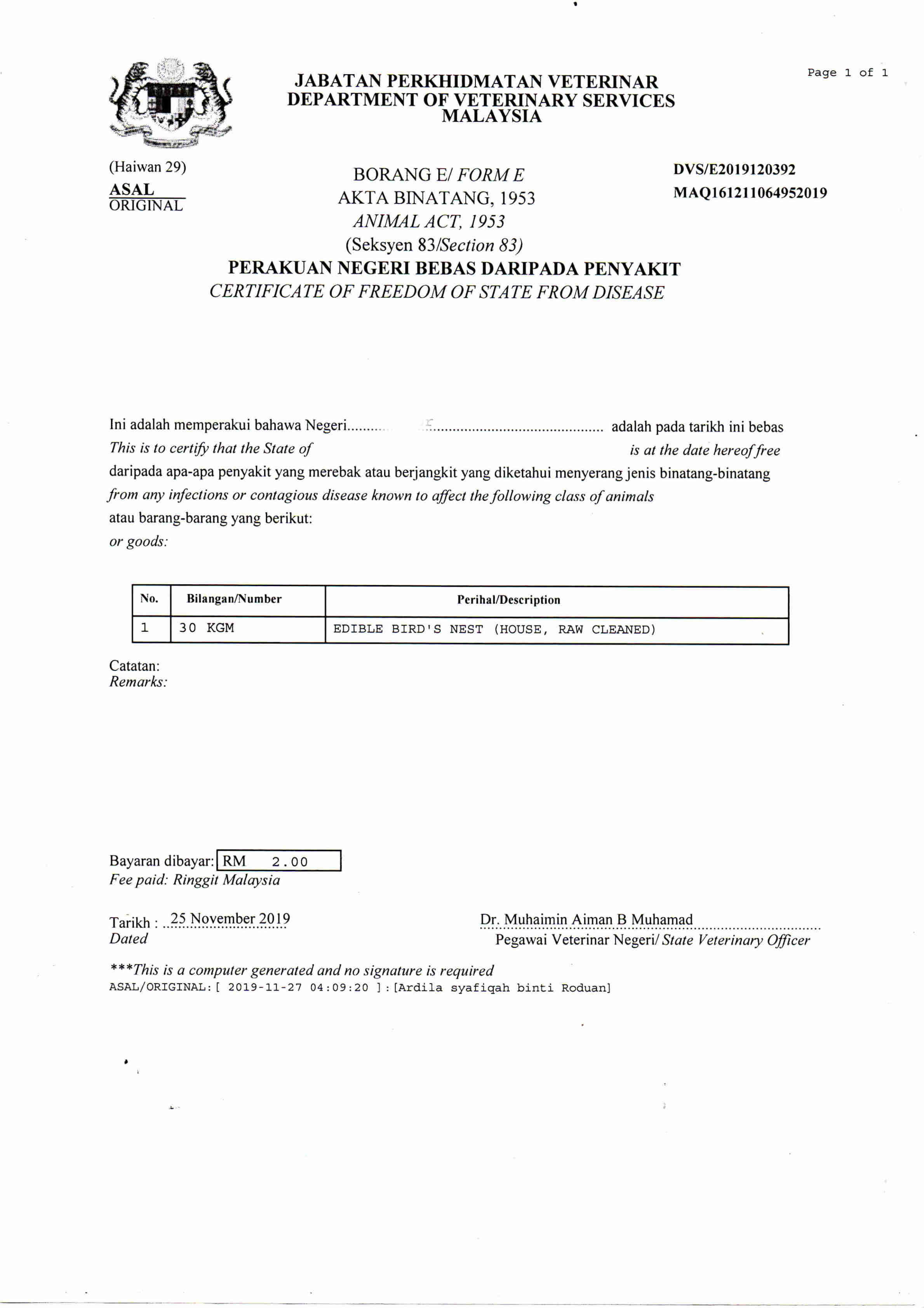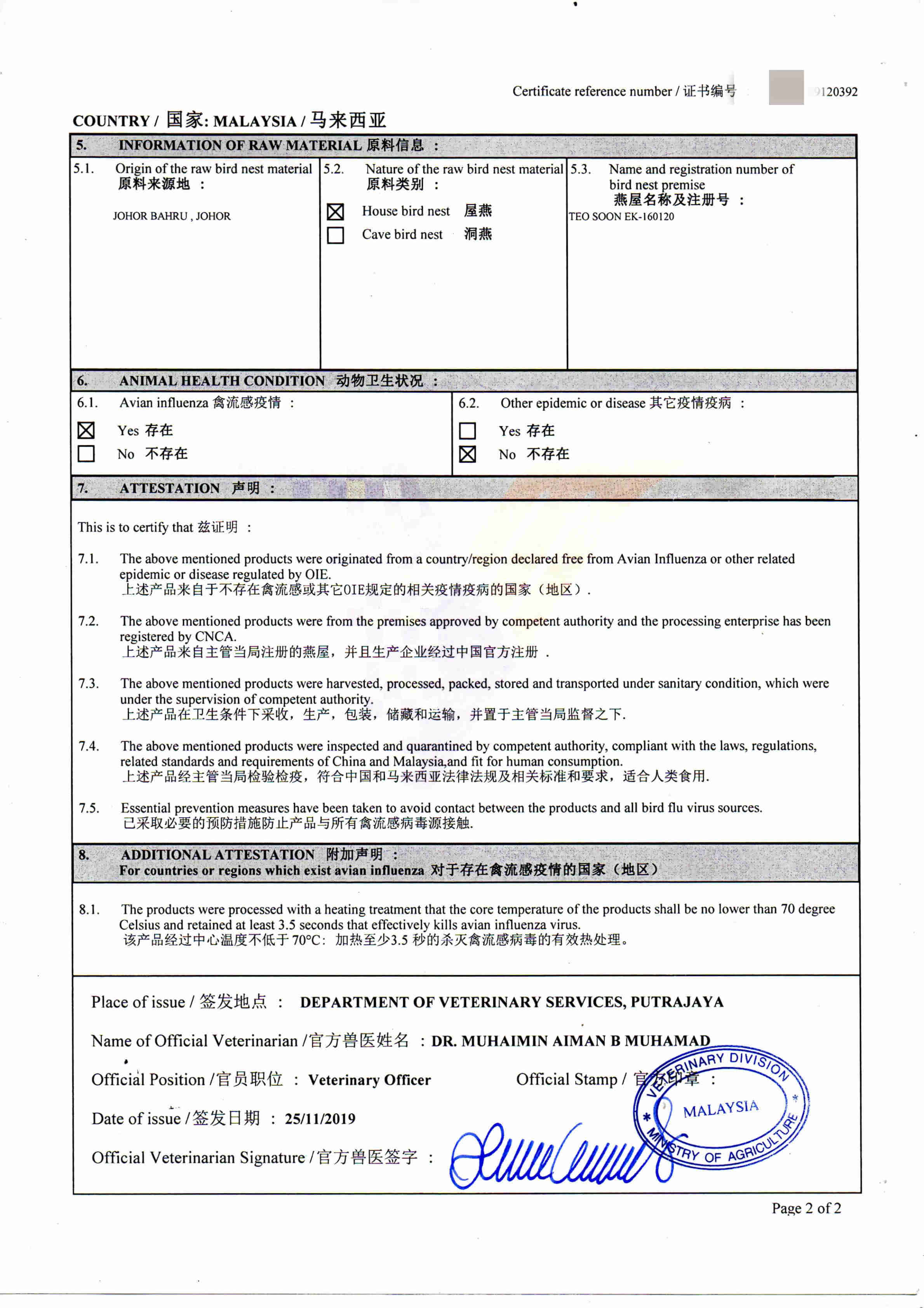 2. 獸醫(yī)衛(wèi)生證 (發(fā)貨人提供)