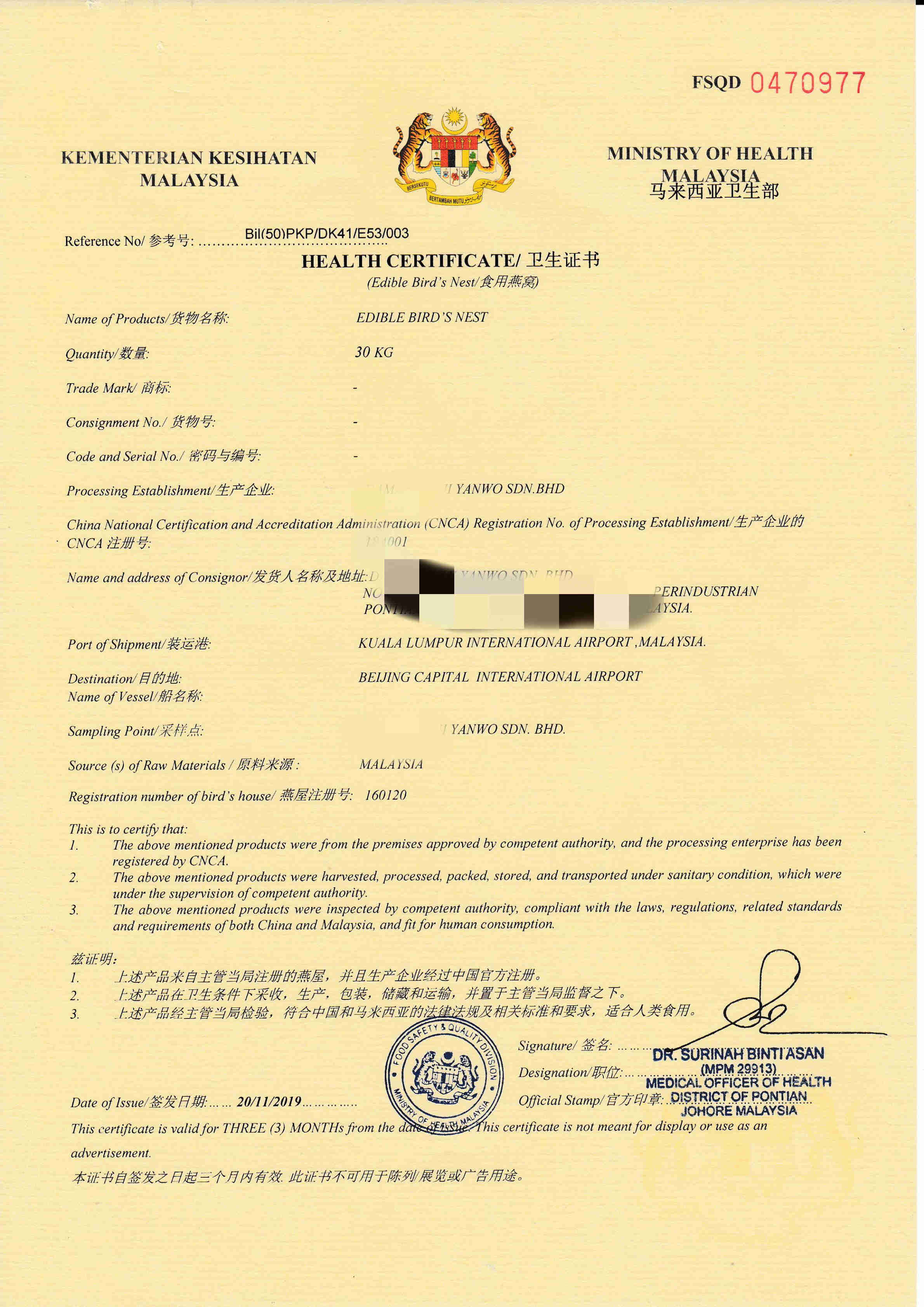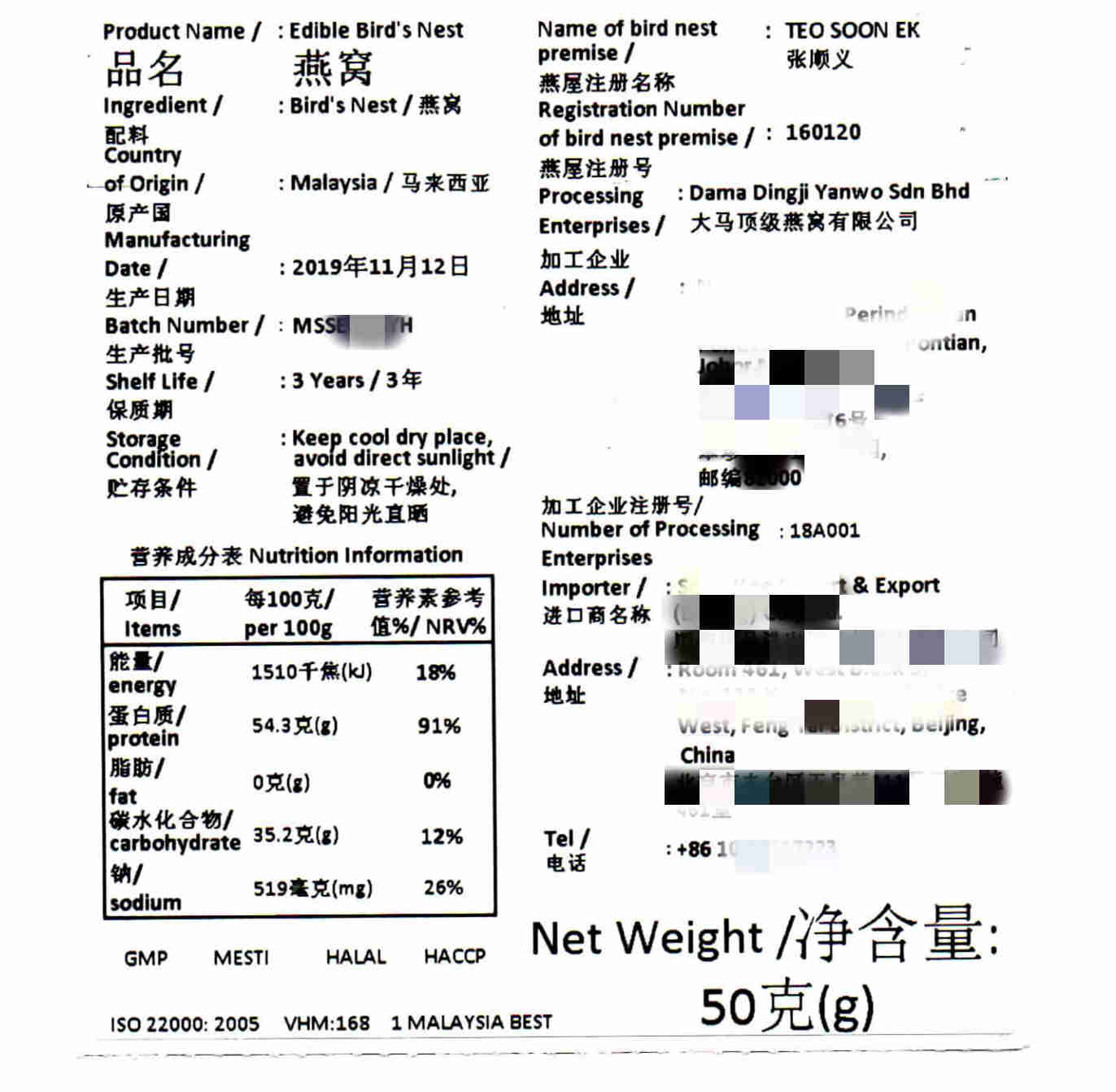 2:中文品名:燕窩