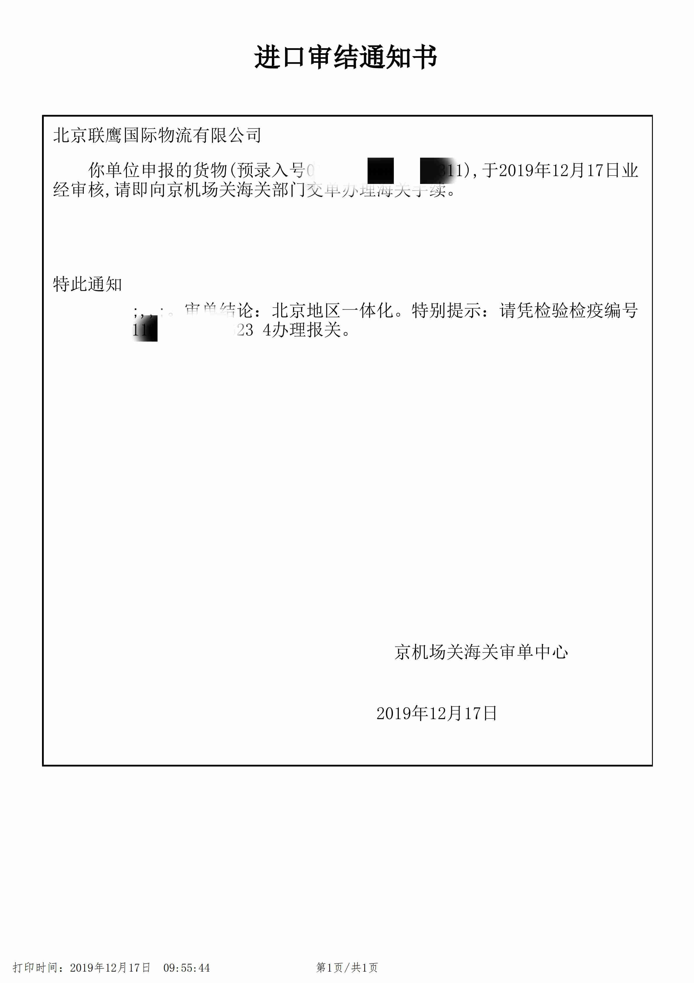 3. 進(jìn)口審結(jié)通知書