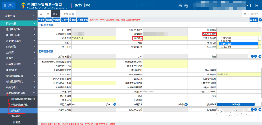 持電子口岸卡介質(zhì)登錄中國國際貿(mào)易單一窗口——“標準版應(yīng)用”——點擊“貨物申報”——“其他檢驗檢疫申報”—“出境包裝”。