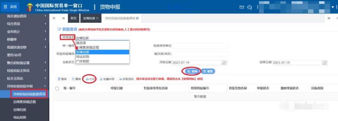企業(yè)網(wǎng)上報檢成功后,按下圖查詢方法將“出入境貨物包裝檢驗申請單”打印出來,并攜帶下方“辦理材料目錄”中的所有資料向所在地海關(guān)申請辦理《出境危險貨物運輸包裝使用鑒定結(jié)果單》。
