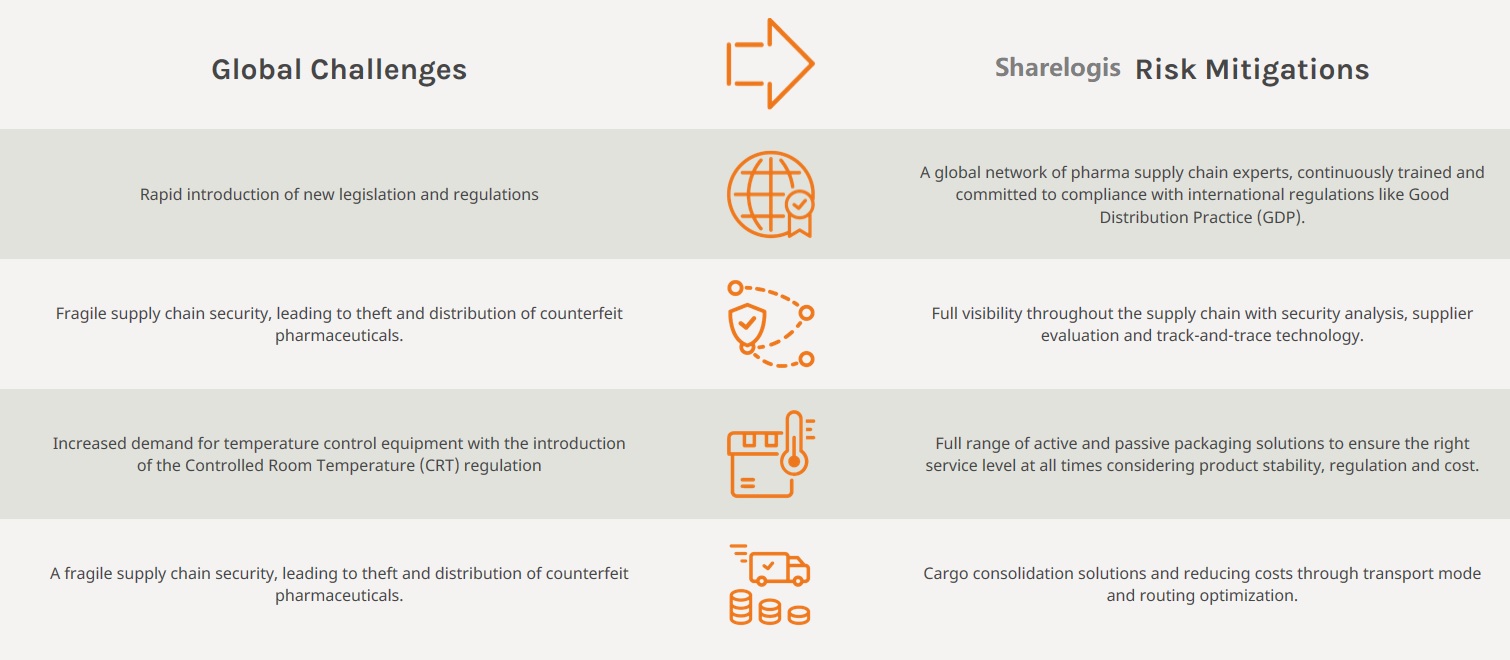 Sharelogis’ solutions meet the unique requirements of the pharmaceutical industry by providing a range of services, including storage in multiple temperature zones, cold-chain solutions, reverse logistics and advanced tracking and tracing technologies, which ensure total supply chain visibility, and reporting on merchandise flows across all modes of transport.